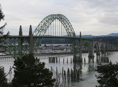 | The Yaquina Bay Bridge is 3223 feet long with a soaring steel arch flanked by two steel deck arches & a "jewelry chain" of five concrete deck arches. |